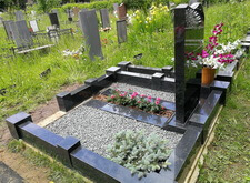 Затем приносим надгробье, предварительно укрепив на нём фотокерамику с изображением усопшего, устанавливаем его. Территорию участка засыпаем каменной крошкой, в цветник сажаем растения, в одном из углов места захоронения организовываем клумбу.
